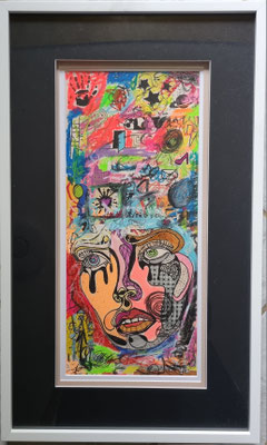 In diesem expressiven Werk begegnen sich Farbe, Form und Fragment in einem stürmischen Geflecht aus Symbolen, Emotionen und innerem