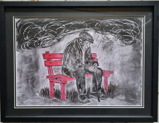 Das Bild zeigt einen alten Mann, der einsam auf einer knallrot gestrichenen Holzbank sitzt. In gebeugter Haltung, den Kopf gesenkt, ruht er mit beiden Händen auf einem Gehstock. Sein Gesichtsausdruck wirkt nachdenklich und erschöpft. Der Mann trägt eine Mütze und einen langen Mantel, sein gesamtes Erscheinungsbild ist in Grautönen gehalten – ebenso wie der Hintergrund.